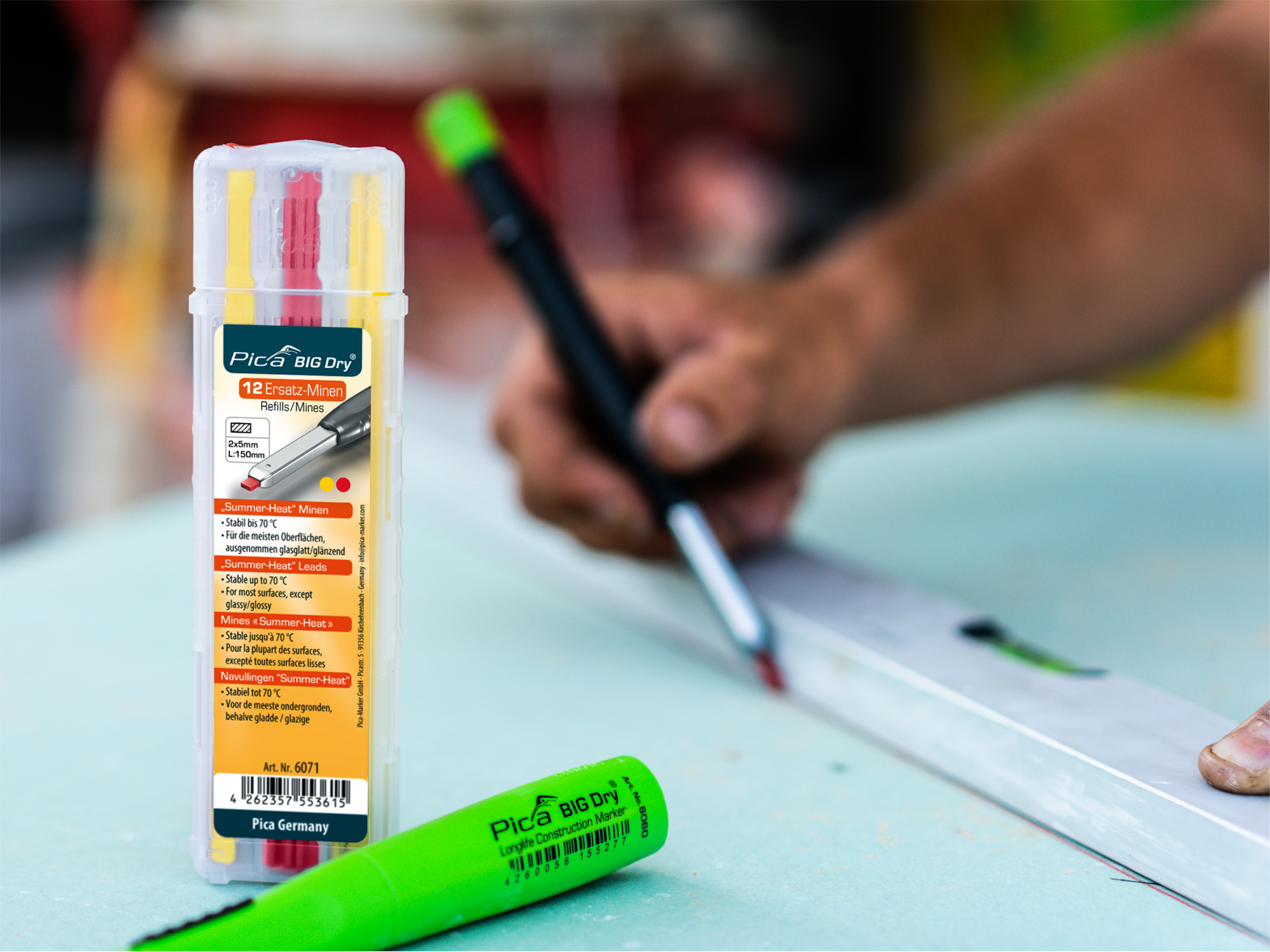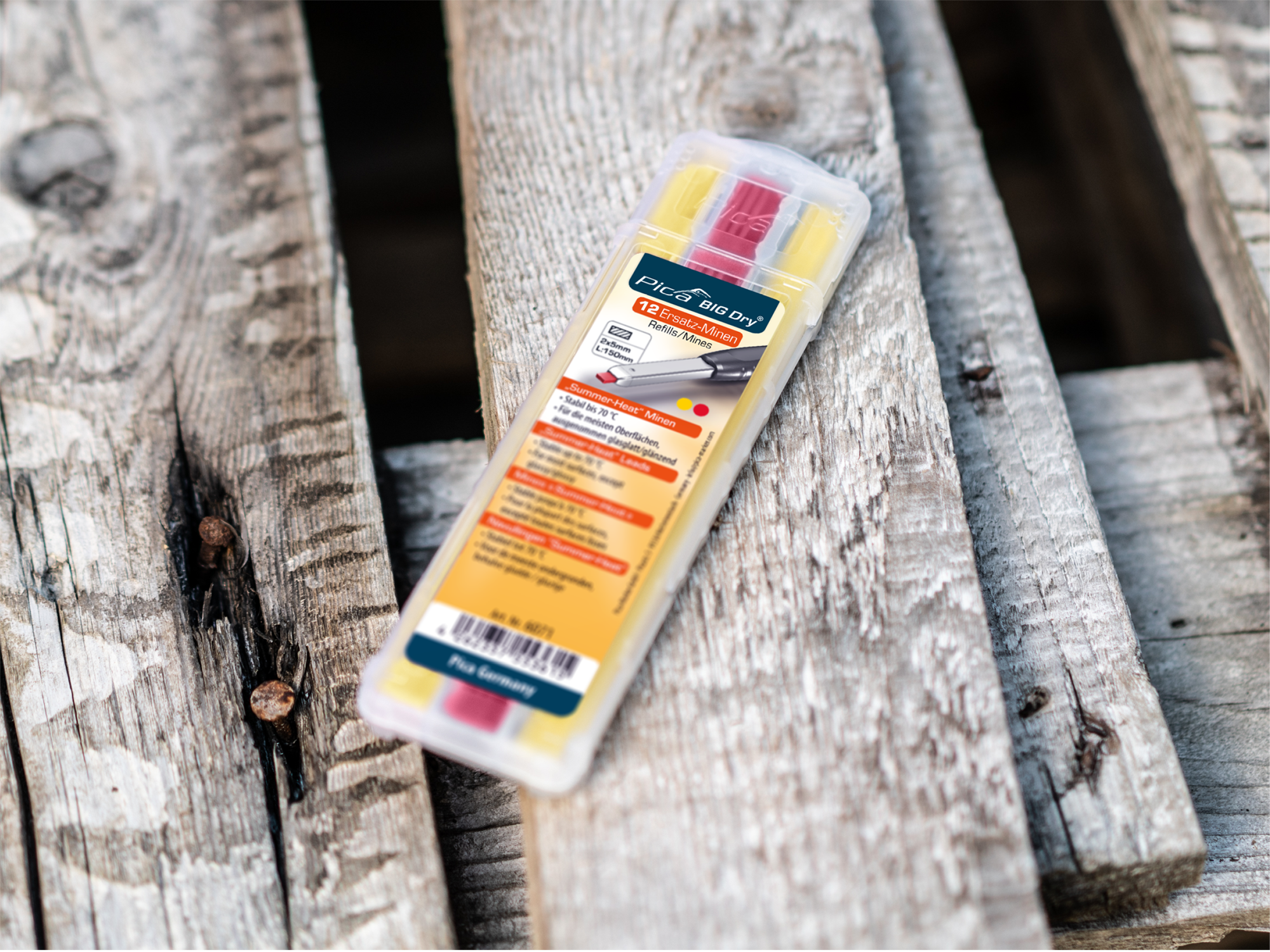 Die Grafit-Minen entfallen – stattdessen besteht das Set nun vollständig aus hitzebeständigen Farbminen, die selbst bei intensiver Sonneneinstrahlung formstabil bleiben und klare Markierungen auf unterschiedlichen Materialien ermöglichen.