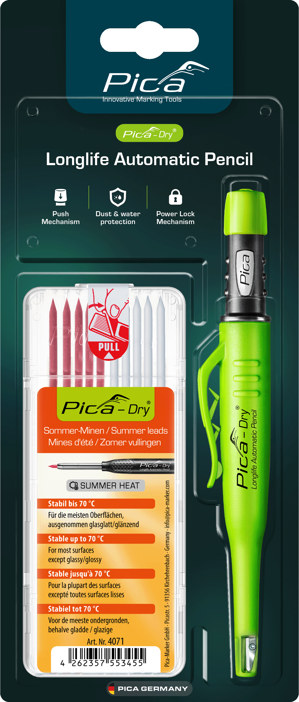 Die Grafit-Minen entfallen – stattdessen besteht das Set nun vollständig aus hitzebeständigen Farbminen, die selbst bei intensiver Sonneneinstrahlung formstabil bleiben und klare Markierungen auf unterschiedlichen Materialien ermöglichen.